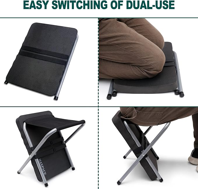 - 【DURABLE & STURDY】The pad, made from high-quality materials, is designed to resist impacts from stones or rough ground when used outdoors. The stool, crafted from thick steel tubing & double-layered Oxford cloth, supports up to 220 lbs.