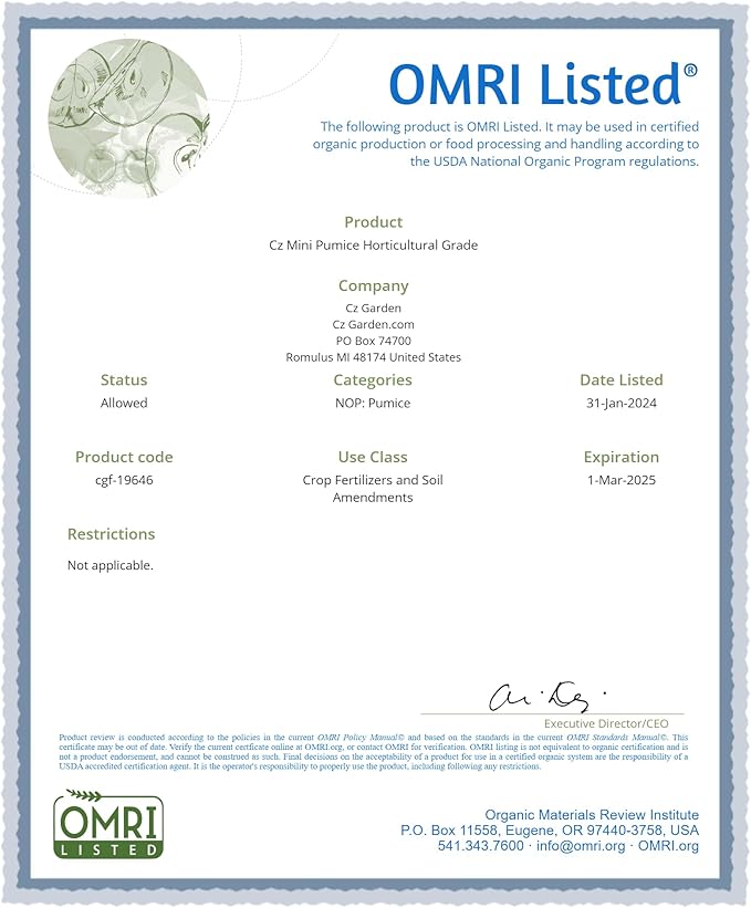 - OMRI Listed - Cz Pumice is an All-Natural soil amendment listed by the Organic Materials Review Institute (OMRI). It may be used in certified organic production or food processing and handling according to the USDA National Organic Program regulations.