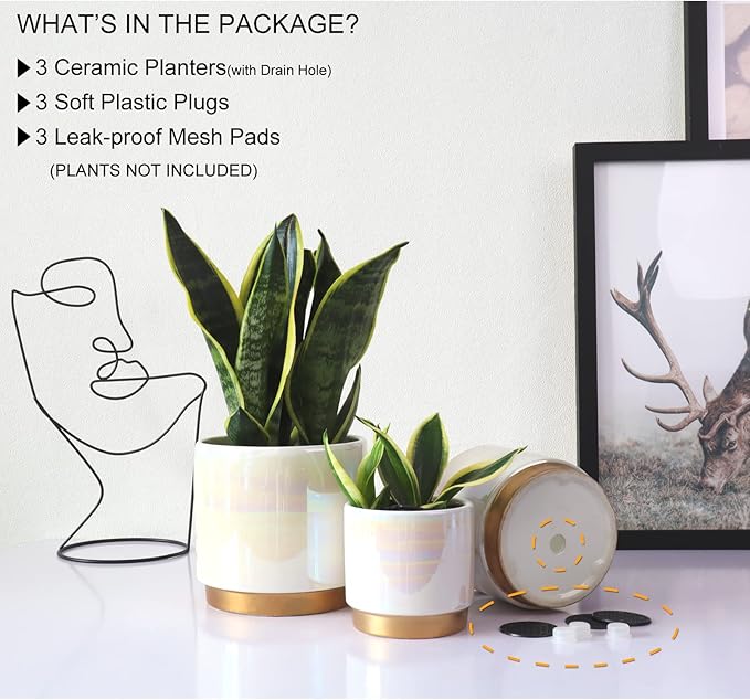 - Size & Package: 6.0 Inch Pot + 5.0 Inch Pot + 4.0 Inch Pot. Package: contains 3 ceramic flower pots, 3pcs mesh pads and 3pcs rubber stopper (NOT INCLUDE PLANTS)