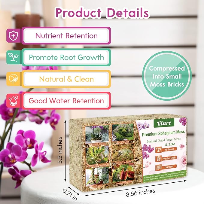 Riare 5.3 OZ Premium Sphagnum Moss for Plants- 6QT Natural Long Fiber Sphagnum Peat Moss Dried, Plants Moss Orchid Potting Mix for Orchids Repotting, Carnivorous Succulent Potted Plants and Reptiles