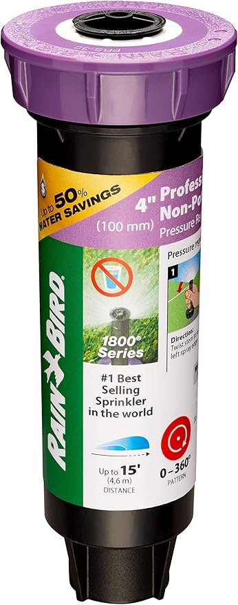 Rain Bird 1804NPPRS Pressure Regulating (PRS) Professional Non-Potable Water Pop-Up Sprinkler, Adjustable 0° to 360° Pattern, 8' - 15' Spray Distance, 4" Pop-up Height, Purple Cap