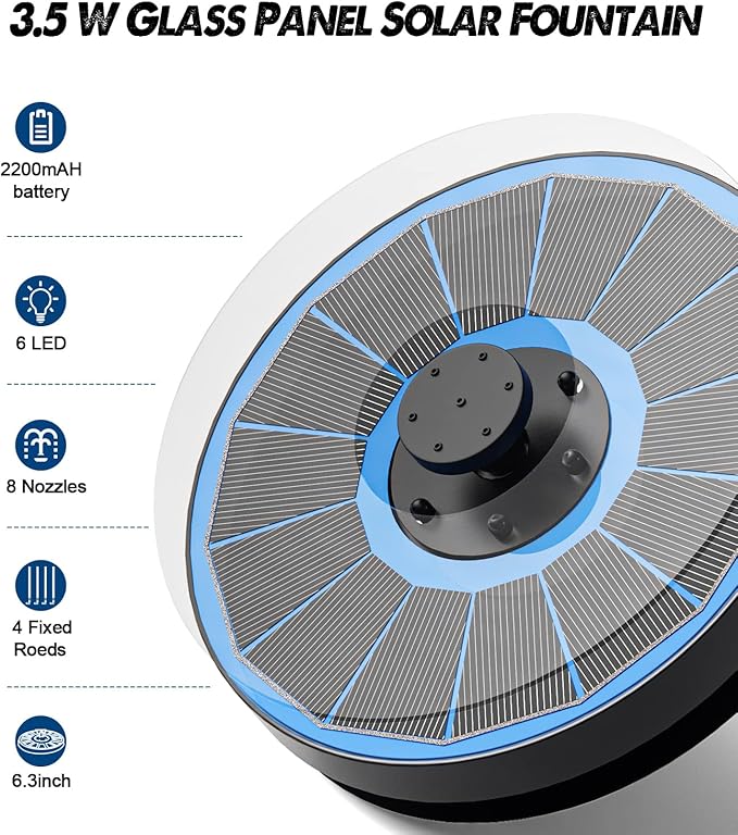 - White LED Lights Solar Fountain:3.5W solar water fountain for birdbath is equipped with 6 LEDs; The white led light will auto light up at night; With 2200 capacity battery, the solar fountain with battery fully charge will provide power for about 3 - 4 hours working at night; During the day, the solar fountain will attract all kinds of birds, like hummingbirds; At night, you and your family can enjoy the wonderful light show; Go and buy our amazing solar fountain with white light to decorate your Garden