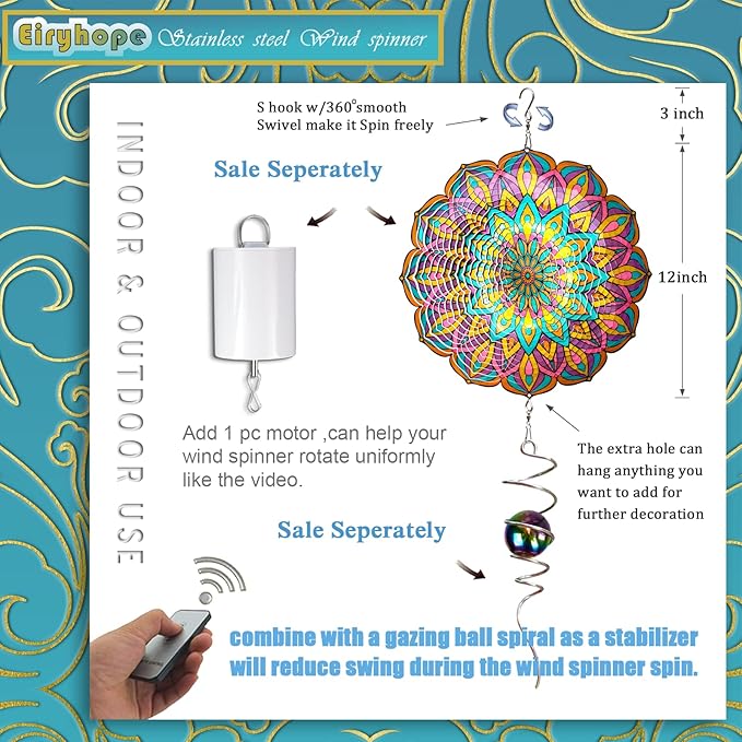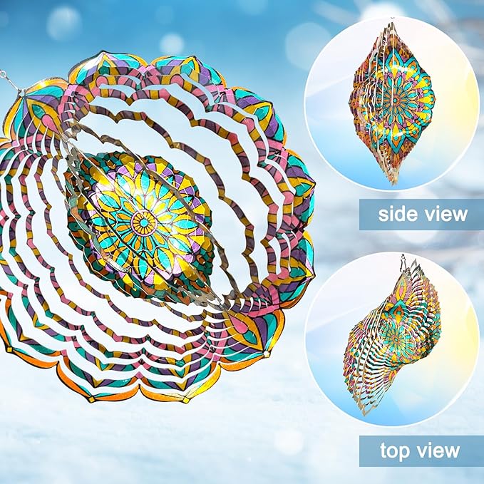 - 【 Easy to Use 3D Wind Spinners 】The garden wind spinner is easy to shape and spin. Its 3D design makes it easy to transform into a 3D hanging wind sculpture. This mandala wind spinner's ingenious metal construction catches more breezes to spin. The 12-inch wind spinner is an eye-catching focal point.