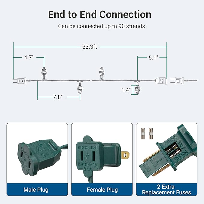 - 【Considerate Design】 Bright C7 LED bulbs, diamond-shape caps, 33.3ft lighted length, 7.8’’ bulb spacing, 4.7’’ lead length; The green sturdy three corded wires completely tangle free and blends easily. Comes with 2 spare fuses.