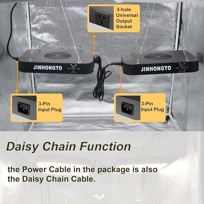 - 【Daisy Chain Function】This led grow lights for indoor plants designed with an input plug and an output outlet. You can connect multi-lights max 4 units together by daisy chain function but only need one outlet.