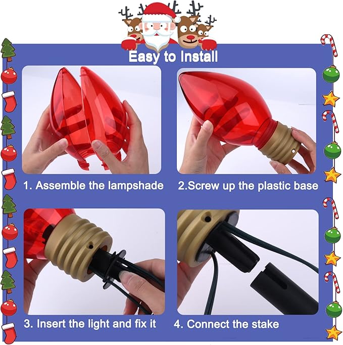 - Product Including: 8.5 feet long green wire string lights with 5 lights bulbs, 5 multicolored jumbos C9 bulbs, and this Christmas light sets come with 1 spare fuse and 2 spare bulbs for easy replacement. Amazing landscape stake lights, perfect for residential, commercial, and holiday decorations
