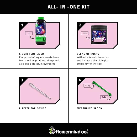 - COMPLETE NUTRITION FOR ALL PURPOSE -Flowermind Nutrition Kit is a nutrient-rich, all-purpose soil additive that can be used for germination, rooting and cloning. It also works well in soil preparation, bringing life and nutrients to the environment.
