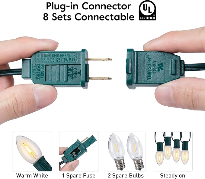 - 【Easy to install and cool to touch】Outdoor waterproof Christmas string lights are easy and convenient to install, just install the end-to-end plug and connect the power supply, up to 8 groups of string lights can be connected at the same time; UL certified LED string lights with high safety, cool to touch