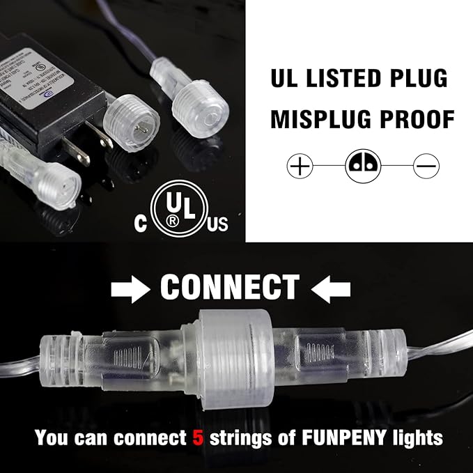 - 【IP65 WATERPROOF】: The Christmas lights has super high IP65 Waterproof leavel, suitable for outdoor using, no worry about the rain, snow or other bad weather.The outdoor lights has UL cerfitied, equipped with the transformer, the string light will work on 7V low voltage which is lower than human body safe voltage.(Note: Please keep the transformer away from submerged in water. )