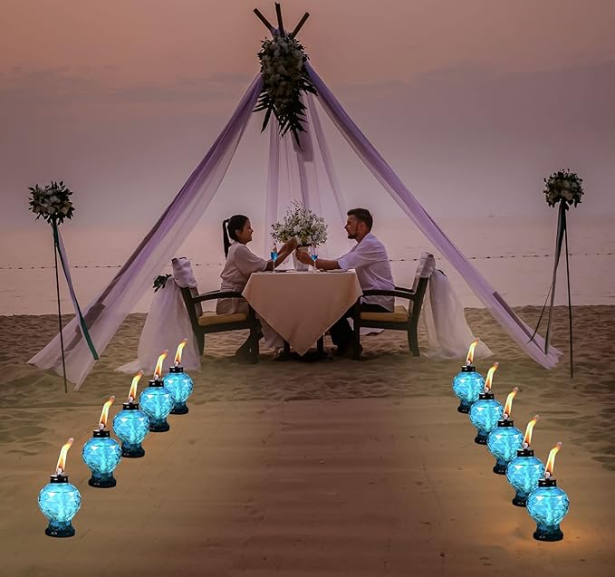 - EASY REFILL BOTTLE MOUTH: The outdoor table torch has a mouth with a diameter of 1.5 inches, which is easier to refill. All you need to do is add oil, install the cap and wick. Light up the glass torches for outside and you can feel the beautiful light effect.