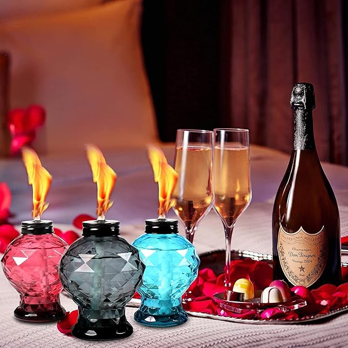 - EXQUISITE GLASS COUNTERTOP TORCH: The total height of the glass torch light with the cover is 6.3 inches, these glass bottle can be used as a delicate desktop decoration. The diamond-like cut surface reflects better lighting. Table torches outdoor perfect for creating beautiful lighting and party vibes when gathering with friends or having a BBQ.