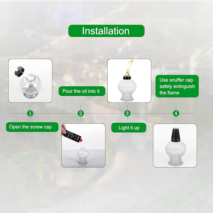 - EASY REFILL BOTTLE MOUTH: The outdoor table torch has a mouth with a diameter of 1.5 inches, which is easier to refill. All you need to do is add oil, install the cap and wick. Light up the glass torches for outside and you can feel the beautiful light effect.
