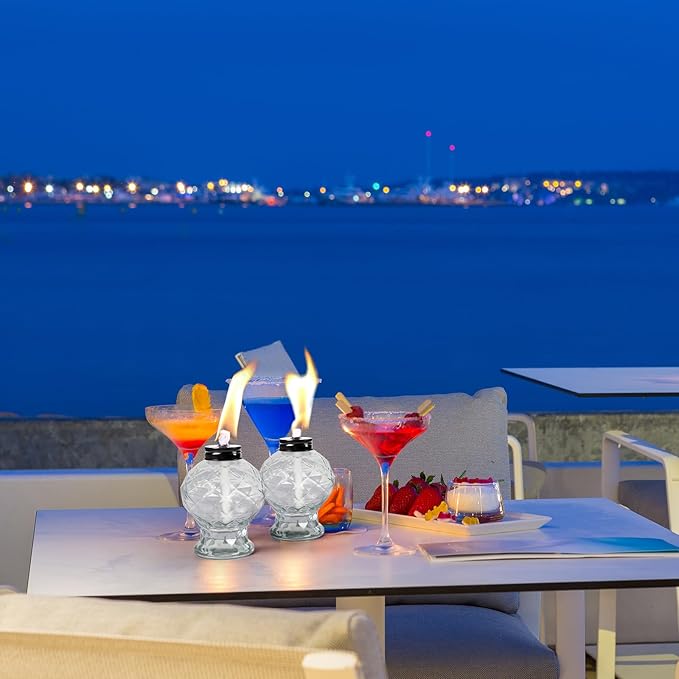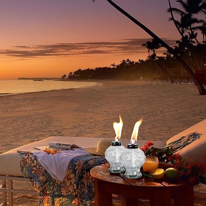 - EXQUISITE GLASS COUNTERTOP TORCH: The total height of the glass torch light with the cover is 6.3 inches, these glass bottle can be used as a delicate desktop decoration. The diamond-like cut surface reflects better lighting. Table torches outdoor perfect for creating beautiful lighting and party vibes when gathering with friends or having a BBQ.