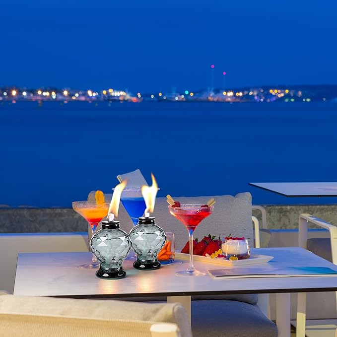 - LIGHT TORCHES PACKAGE INCLUDED: Our citronella table torches package contains 4 minimalist glass desktop torch lights, all with fire caps and wicks, no need to assemble. The small and unique design style is suitable for gardens, parties, lawns, patios, homes, outdoor table decorations for patio etc.