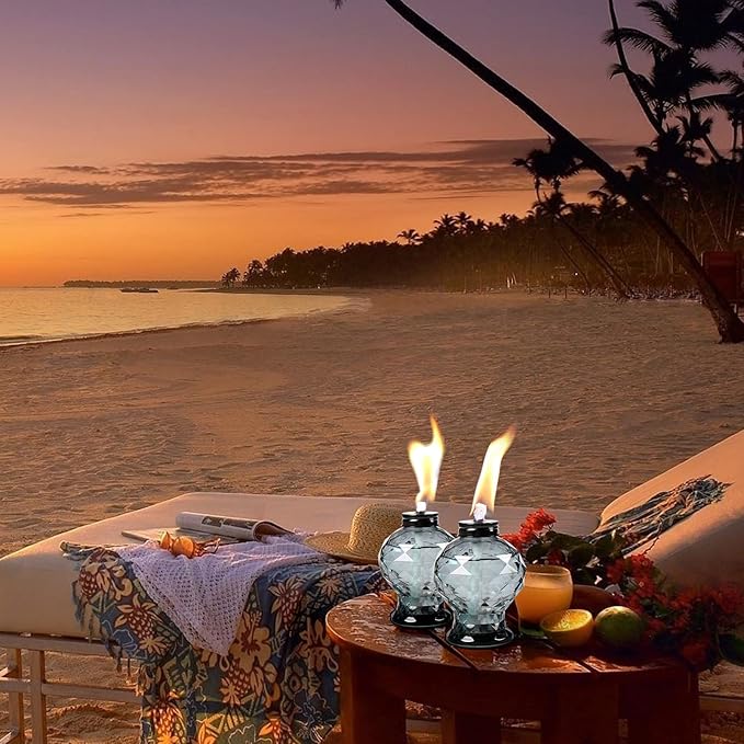 - EXQUISITE GLASS COUNTERTOP TORCH: The total height of the glass torch light with the cover is 6.3 inches, these glass bottle can be used as a delicate desktop decoration. The diamond-like cut surface reflects better lighting. Table torches outdoor perfect for creating beautiful lighting and party vibes when gathering with friends or having a BBQ.