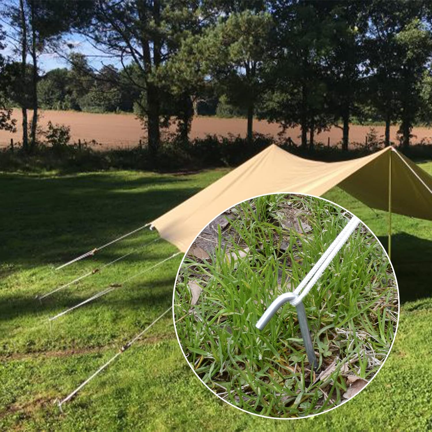 - TENT STAKES PEGS: Galvanized metal camping tent stakes with ties and T hook, suitable for anchoring camping tents, canopies, tarps, flowers, trees, vegetables, gazebos, landscaping or garden plants and shelters. The tent nails are also applicable for anchoring netting, garden fabrics, twine cloches, and other garden structures.
