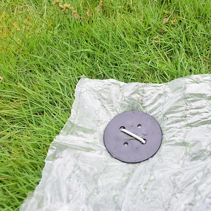 - 【50 Pack Ground Staples Gasket Caps】-- Stakes with 50pcs reusable gasket washer caps, 2.3" in diameter, 2mm in thickness, installation center distance is 1". Garden staples with caps can increase the contact area of weed fabric barrier or the ground, helps prevent the stake from tearing the vapor barrier.