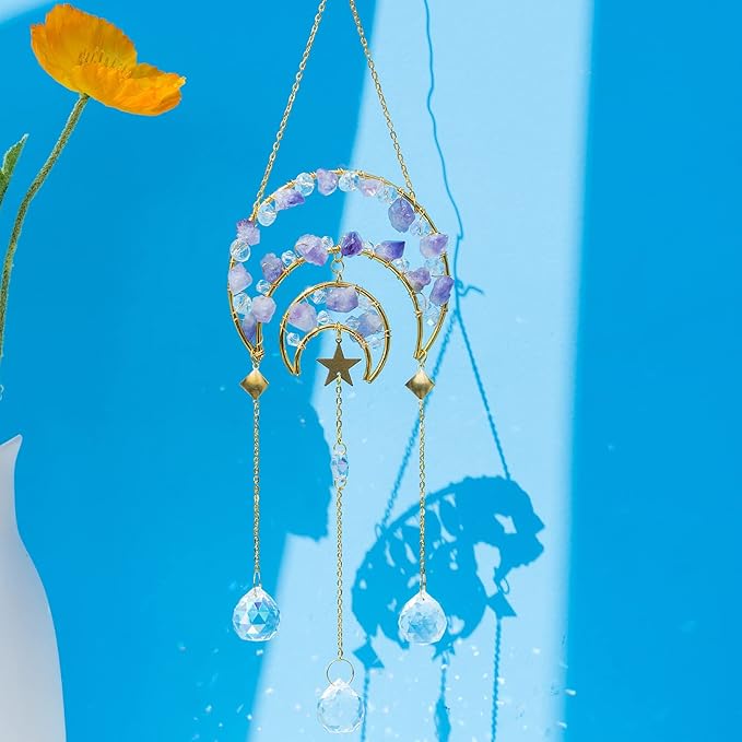 Amethyst Crystals Suncatcher - Hanging Moon Sun Catcher with Glass Prisms for Windows, Healing Amethyst Crystal Decor for Home, Gift for Christmas Birthday Valentine Mothers Day