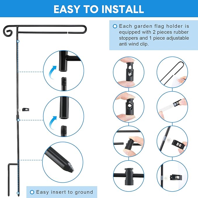 - Package Includes: you will receive 10 pieces of 3-piece folding poles, 20 pieces rubber stoppers and 10 pieces adjustable anti wind clips, abundant quantity to meet your needs; The anti wind clip can fix your flag, prevent your flag from falling off or winding in the winds; The flag stand is designed for garden flag; Please note the garden flag is not included