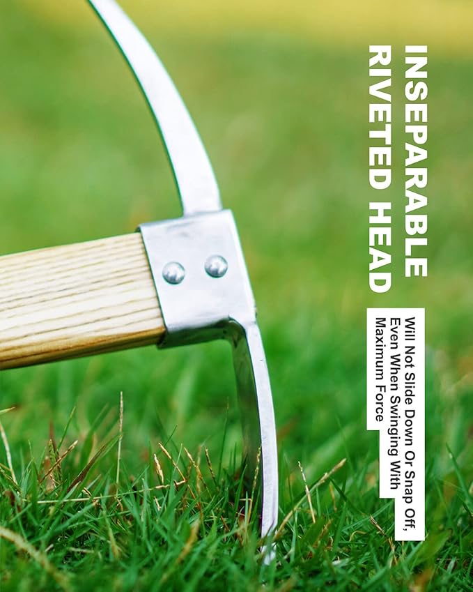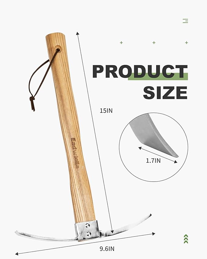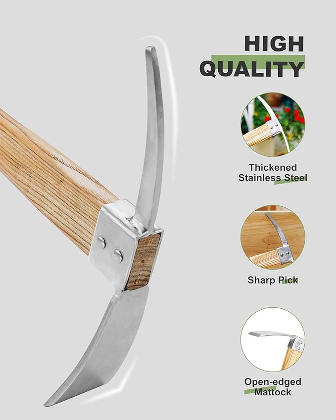 - HIGH QUALITY - The head has a combination of a vertical axe blade on one side and a horizontal adze blade on the other side and has a weight of 0.9 lb. This gives the mattock head a T-shaped design. Made of high stainless steel, the blade is very sharp & cuts tough weeds & roots with ease. The pick hoe is also good for cultivating soil. The blade is slightly curved, which helps dig into the soil easily. The blade also easily resharpen when the need arises.