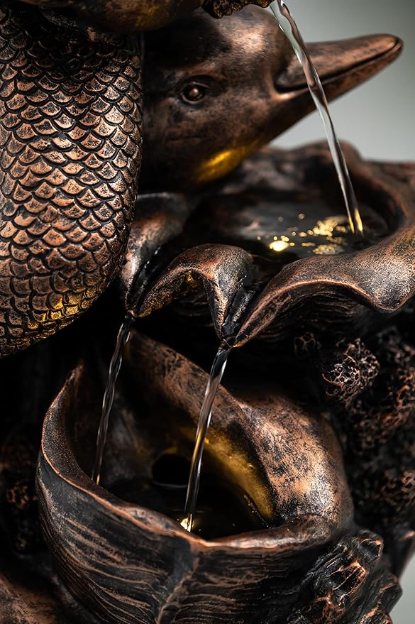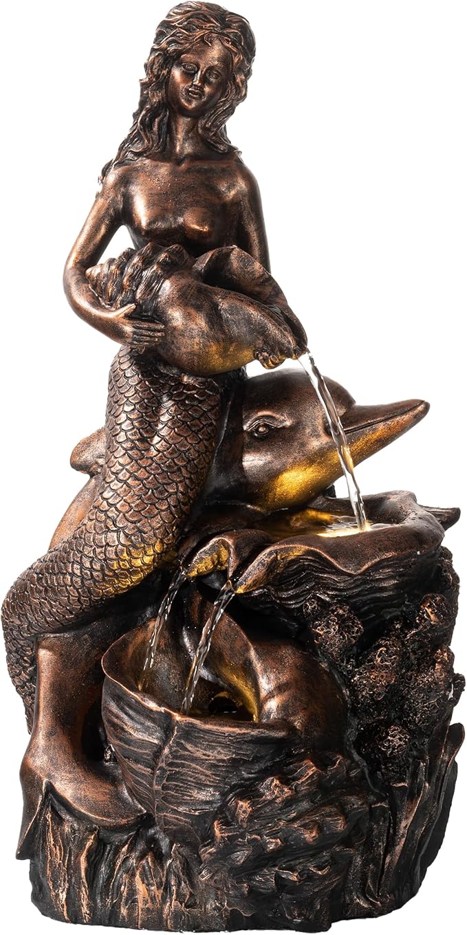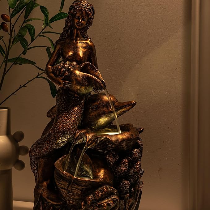 - 【Original Design】 This fountain features beautiful mermaids, cute dolphins, and a 3-level water flow design that mimics the sound of a real waterfall. Water flows down from each layer of shells or conches, creating a circular, gentle, and soothing sound that adds a serene atmosphere to your indoor and outdoor environment.