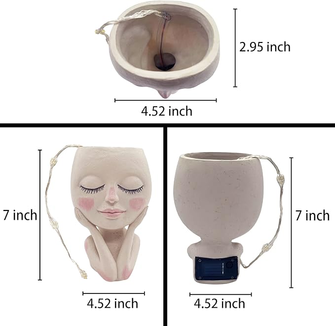 - 🌼【Unique Design】Solar unique face planters maked with drainage hole,With 30 LED lights for DIY various shapes.Product length is 4.5 inches. The width is 3.5 inches. Solar light string in the flowerpot is protected by a casing, which is moisture-proof, sun-proof and IP65 waterproof, suitable for various planting. can withstand different weather conditions.
