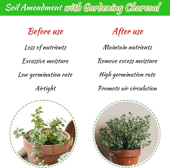 - Soil Amendment: Our garden charcoal through layer-by-layer screening and mesh sieving, you will get 6 qt charcoal obtained which size is 3-7 mm, small to medium size to keep soil from compacting on roots of potted plants, small size is perfect for houseplants and can be easily mixed into the soil; Black charcoal absorbs heat from the sun, which increases soil temperature and encourages seed germination