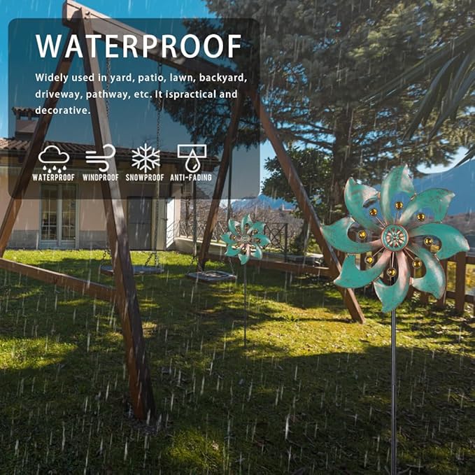 - Wind Spinners: Outdoor wind spinner is made of rustproof and waterproof metal. The blades emit brilliant colors as they spin with the wind, creating a beautiful visual experience in the garden