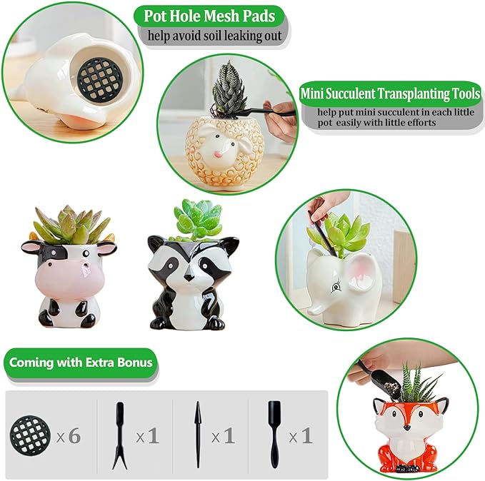 - Functional Practical Accessories: 6pcs pot hole mesh pads avoid soil leaking out when planting succulents into the mini plant pots for succulents. A screen go over drain hole! 3pcs mini transplanting tools help you put mini succulent in each little pots for plants easily with little efforts.