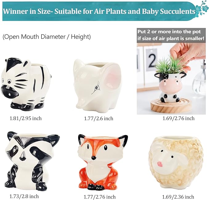 - Winner in Size: Suitable for Air Plants Holders and Baby Succulents. Air plant pot opening is from 1.69to 1.81 inch, fit for most air plants. Put two or more in if size of your air plants are smaller. Perfect air plant stand! Drainage hole at our Animal flower pots bottom to allow water to flow through the soil. Plants breath healthily in the mini ceramic pots for succulents. Also great for herbs ,cactus and small plants and flowers. Great mini succulent pot planter tiny plant pots!