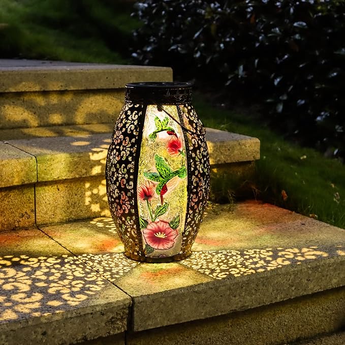 - 【Unique Glass Solar Lantern 】Hanging solar lantern feature a exquisite cardinal pattern, the vintage appearance will be unique addition for your garden or tabletop,and creating warm illuminated charm.