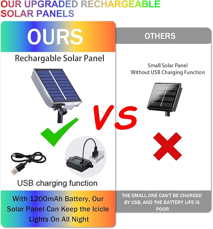 - 【Upgraded Solar Panel】Our upgraded solar panel added power indicate light,this light can display the percentage of power, each cell represents 25% of the power.A USB charging port (5v input) added in the solar panel,you can charge it when cloudy or rainy day.New designed solar panel comes with a clip which allows the solar panel to be clamped to the fence and branches.It's ideal decoration lights for Christmas,Halloween,Thanksgiving,party,garden,patio decor.