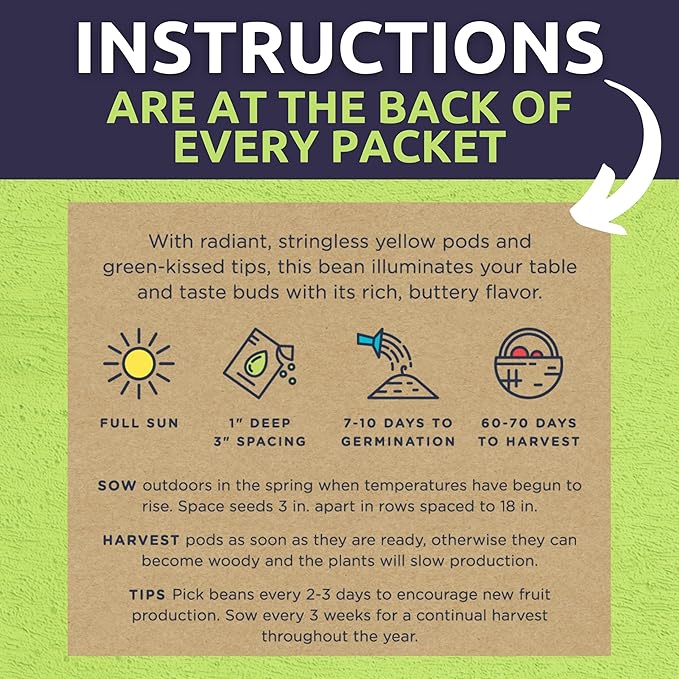 - 5 INDIVIDUAL SEED PACKETS: Golden Wax Bush Bean, Provider Bush Bean, Cannellini Shelling Bean, Maxibel Haricot Vert Bush Bean, Red Podded Yard Long Bean.