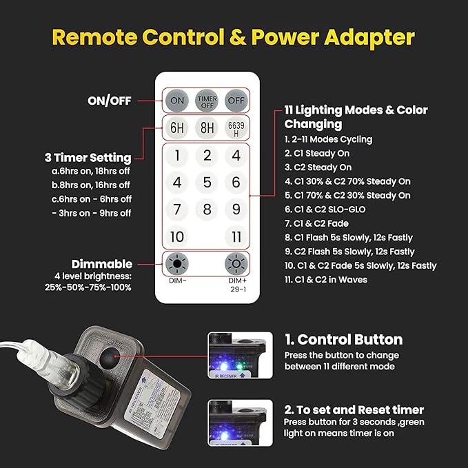 - 11 lighting modes and 3 timer setting with remote: combination, in waves, sequential, slogs, chasing/flash, slow fade, twinkle/flash and steady on. Different modes suitable for the different occasion