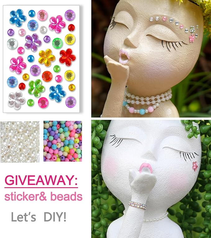 - 🌴【GIVEAWAY: STICKER & BEADS】 Stickers & beads are included in the package.No need to buy extra DIY material.You can make a necklace/bracelet out of beads,put them on the lady face planter, or stick rhinestone. Let’s Enjoy the Fun of DIY!