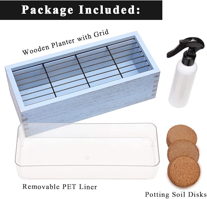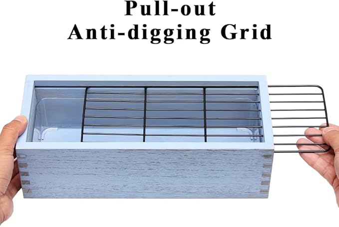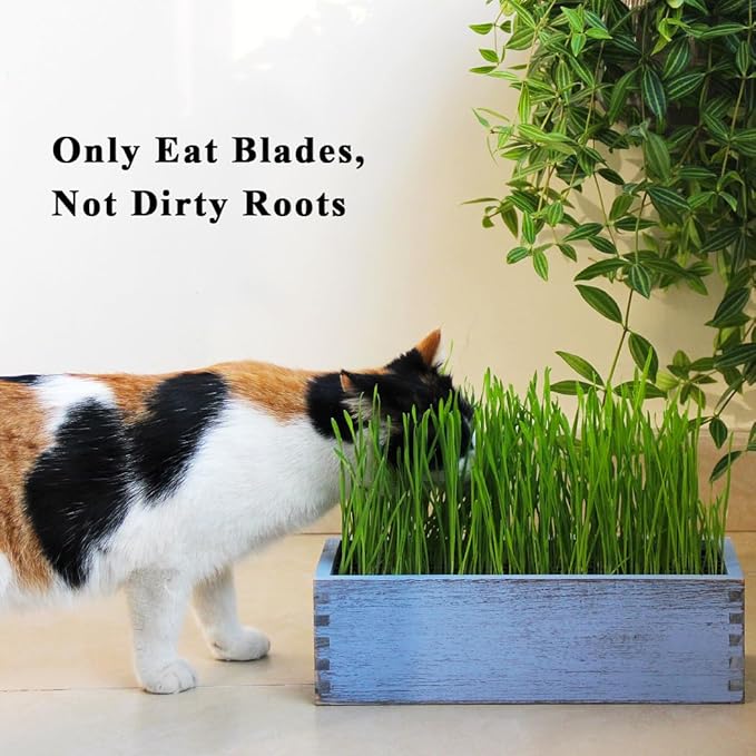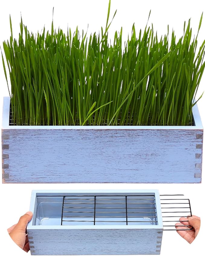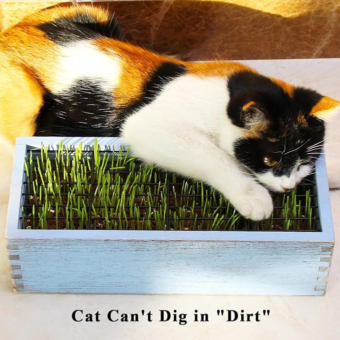 Wooden Cat Grass Planter (no Seeds Included) with Potting Soil Disks, Anti-Digging Grid and Removable Plastic Liner, Wheat Grass Growing Pot, Cat Grass Kit for Indoor Cats Pets (Amber Blue)