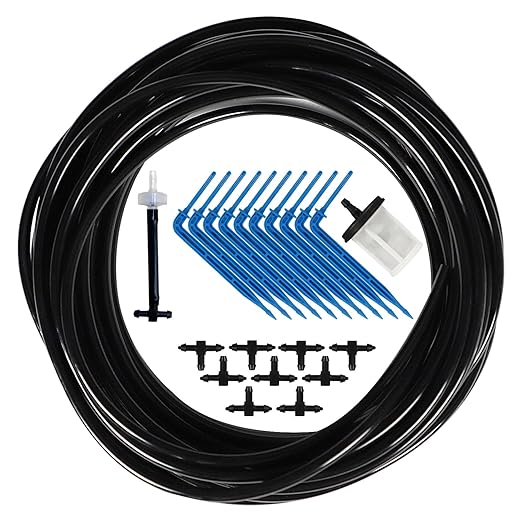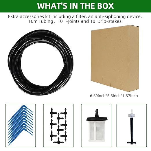 - What's in the Package: This is expansion or extra accessories kit, including a filter, an anti-siphoning device, 10 meter Tubing, 10 Pieces of T-Joints and 10 Pieces of Drip-stakes.Marvel Technology CO.,LTD