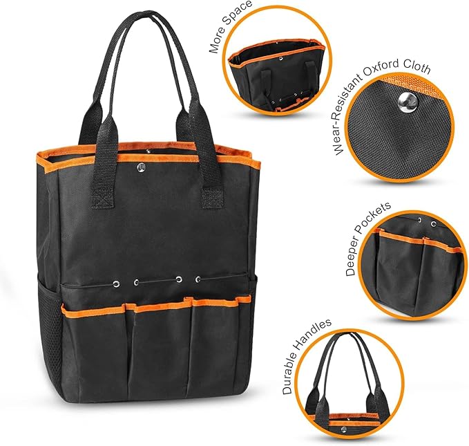 - DURABLE TOTE BAG - The gardening bag made of strong and wear-resistant 600D oxford cloth. The interior of the tote is spacious enough to store garden set or small plants. The exterior of the garden bag has eight pockets for easy storage of gardening tools. The fixed elastic ring can fix the tool in place without dropping them by accident