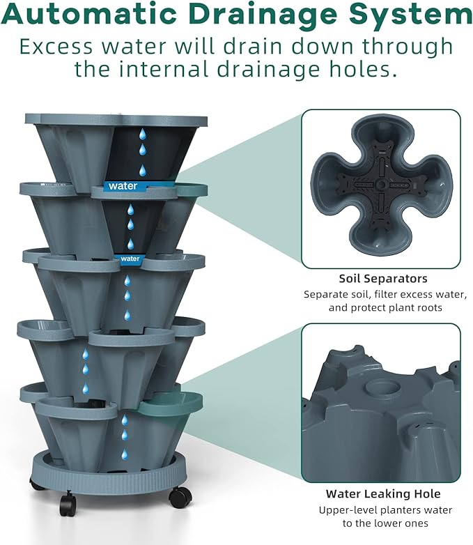 - Flow Design - The water filtration system from top to bottom can save water and retain moisture but prevents overwatering or root rot. 5 filters are placed on each level to keep the soil from going through the big drainage holes, it also helps retain water in each planter level.