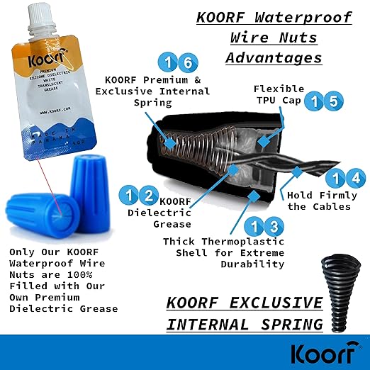 - ✔ APPLICATIONS IN MANY INDUSTRIES, PROBEN RESISTANCE TO VIBRATIONS: All our Waterproof Wire Nuts are Filled only with our Own KOORF DIELECTRIC GREASE, tested in Pumps, heavy equipment, and used as automotive electrical connectors with a top-of-market vibrations resistance. OUR DIELECTRIC GREASE is also available on Amazon under the part number B0B8XJ5JXP (ASIN) and also in our store. More Reliable: Our waterproof wire connector is RoHS Compliant. / We applied and complied with RoHS testing to protect our customers keeping you and your customers safer and weatherproof.