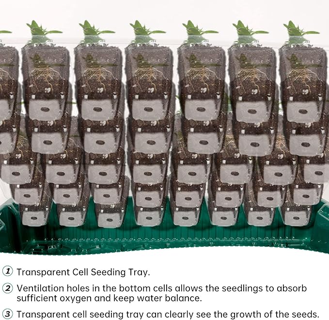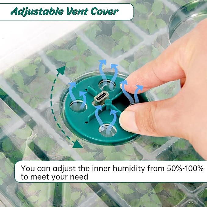 - Seed Starter Tray for Planting: Seeding trays are made of plastic with PVC clear cover. Each cover is equipped with 8 vents, which can regulate the air humidity. The bottom of the tray with drain holes for proper drainage, providing ideals conditions for seed germination and growth.