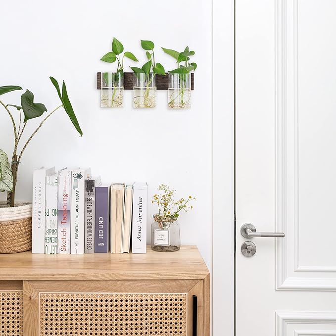 - Size:Wood:11.4''x2''x1'', glass vase: 4''H, diameter:2.6'' , meet most of hydroponic plants need. Detachable vases can be easily hung or removed and easy to change water and cleaning, Note: No plants or props included in this item!