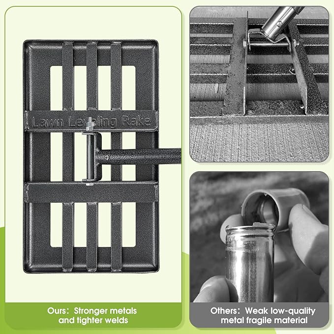 - Premium Lawn Leveling Rake: Our lawn leveling rake is made of high-quality metal, including the pole and rake head. It is not only hard and durable, but also waterproof and rust-resistant, making it ideal for long-term use.