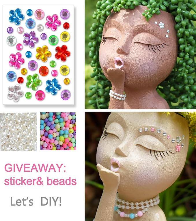 - 🌴【GIVEAWAY: STICKER & BEADS】 Stickers & beads are included in the package.No need to buy extra DIY material.You can make a necklace/bracelet out of beads,put them on the lady face planter, or stick rhinestone. Let’s Enjoy the Fun of DIY!