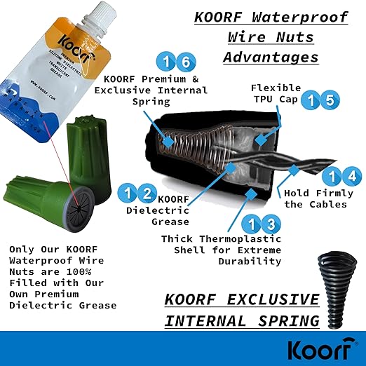 - ✔ APPLICATIONS IN MANY INDUSTRIES, PROBEN RESISTANCE TO VIBRATIONS: All our Waterproof Wire Nuts are Filled only with our Own KOORF DIELECTRIC GREASE, tested in Pumps, heavy equipment, and used as automotive electrical connectors with a top-of-market vibrations resistance. OUR DIELECTRIC GREASE is also available on Amazon under the part number B0B8XJ5JXP (ASIN) and also in our store. More Reliable: Our waterproof wire connector is RoHS Compliant. / We applied and complied with RoHS testing to protect our customers keeping you and your customers safer and weatherproof.