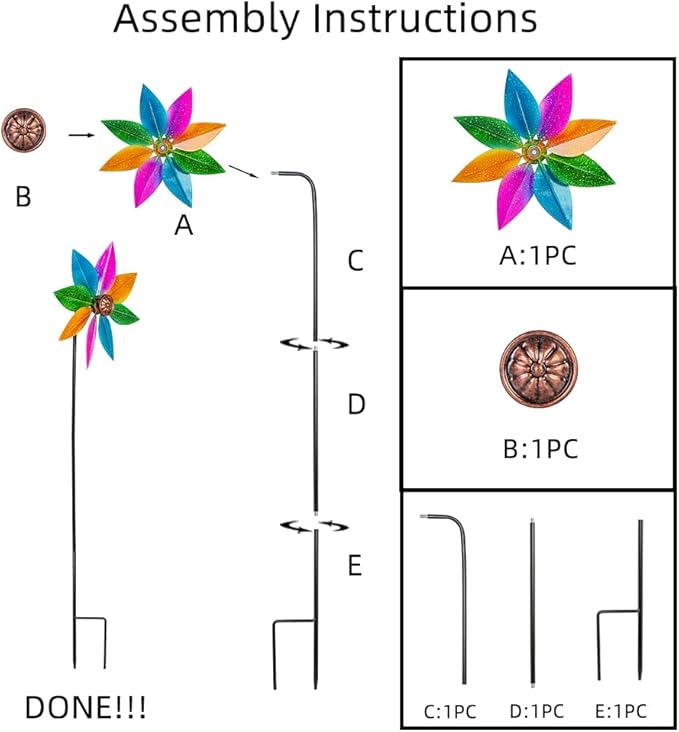 - [Easy to Assemble] DREAMYSOUL metal colorful pinwheel is easy to assemble. Tighten the parts piece by piece with our instructions, and then insert metal stake into soil or grass. Enjoy the beautiful visual experience in your garden.