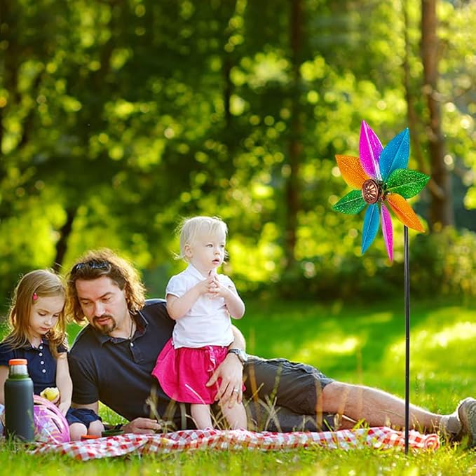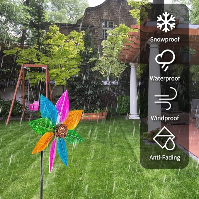 - [High Quality] Garden pinwheels is made of rustproof and waterproof metal and the colorful blade are coated with an anti-fading coating. Yard pinwheels spinners spins when driven by the breeze to create a dynamic spinning effect.