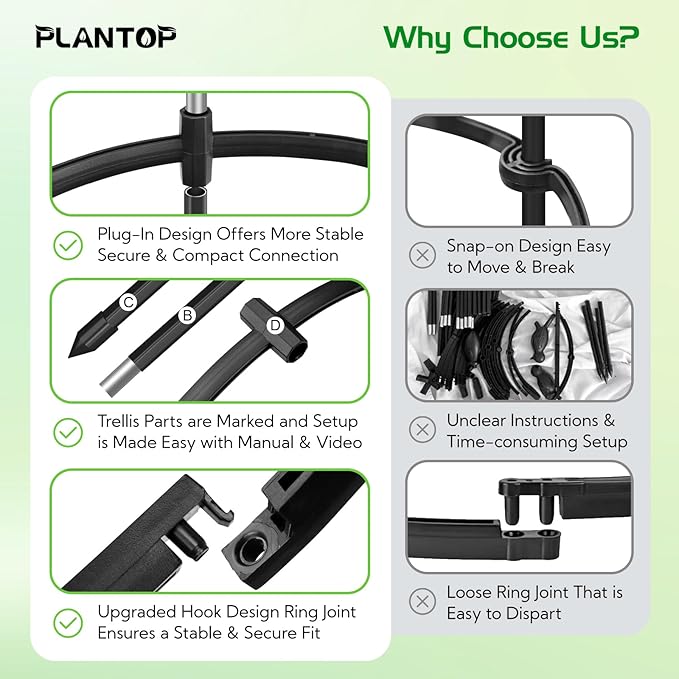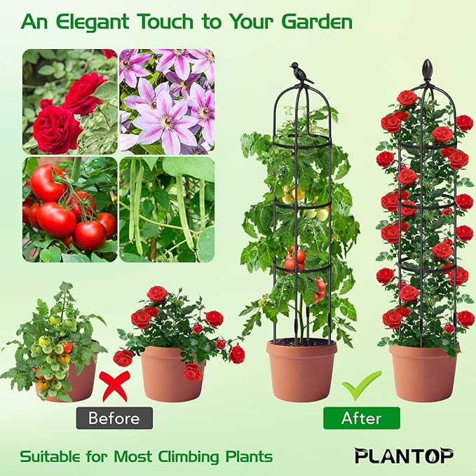 - 🍅【Sturdy & Compact Plant Trellis】Different from other plant support trellis, PLANTOP vertical tomato tower garden obelisk trellis have the newest plug-in connection, and unique double-layer metal tube built-in interface design to stay together tighter and more stable. The durable structural plant cage trellis can carry heavy loads, ensures that your plant's fruits do not weigh down the stem and keep your plants upright and elegant, adding life to your home!