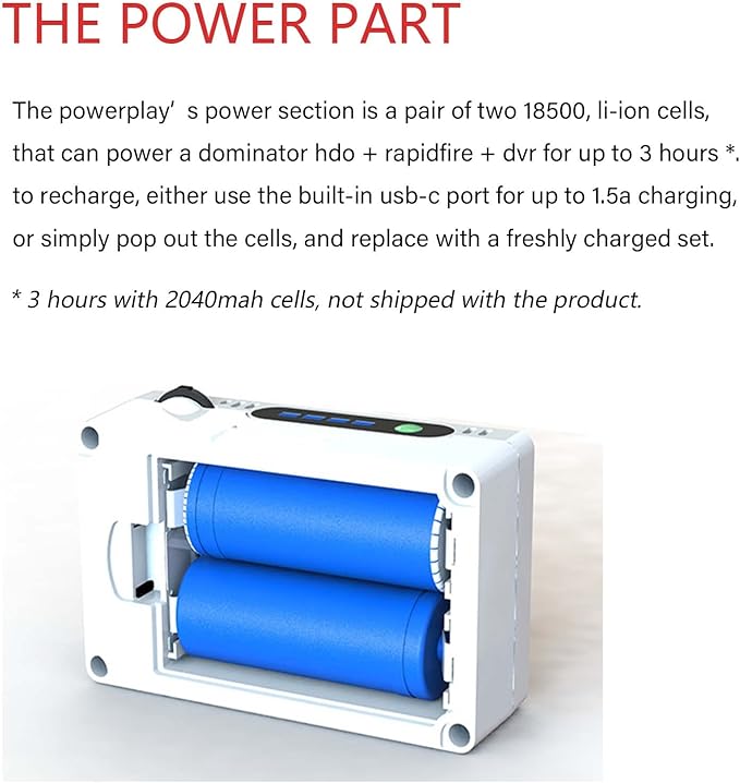 - Suggest use 2X 18500 LI-ION CELLS as the power section that can power a dominator hdo + rapidfire + dvr for up to 3 hours