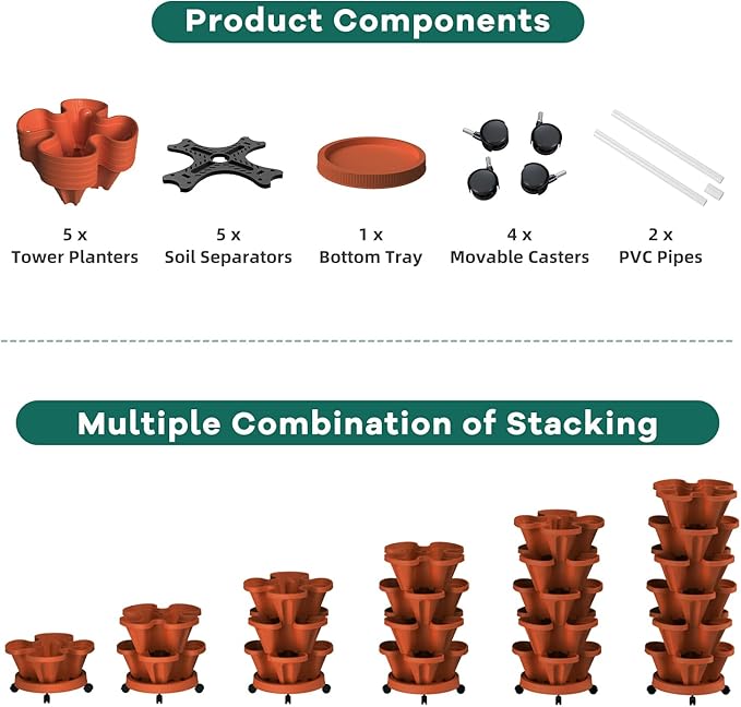 - 5 Tier Vertical Planter - 5 tier stacking planter, made of BPA-free material, can hold up to 20 different plants, such as strawberries, spinach, leaf lettuce, arugula, and mustard greens, and a few smaller herbs and flowers. Plus, it's the perfect vessel for strawberries as the berries cascade over the container lip.